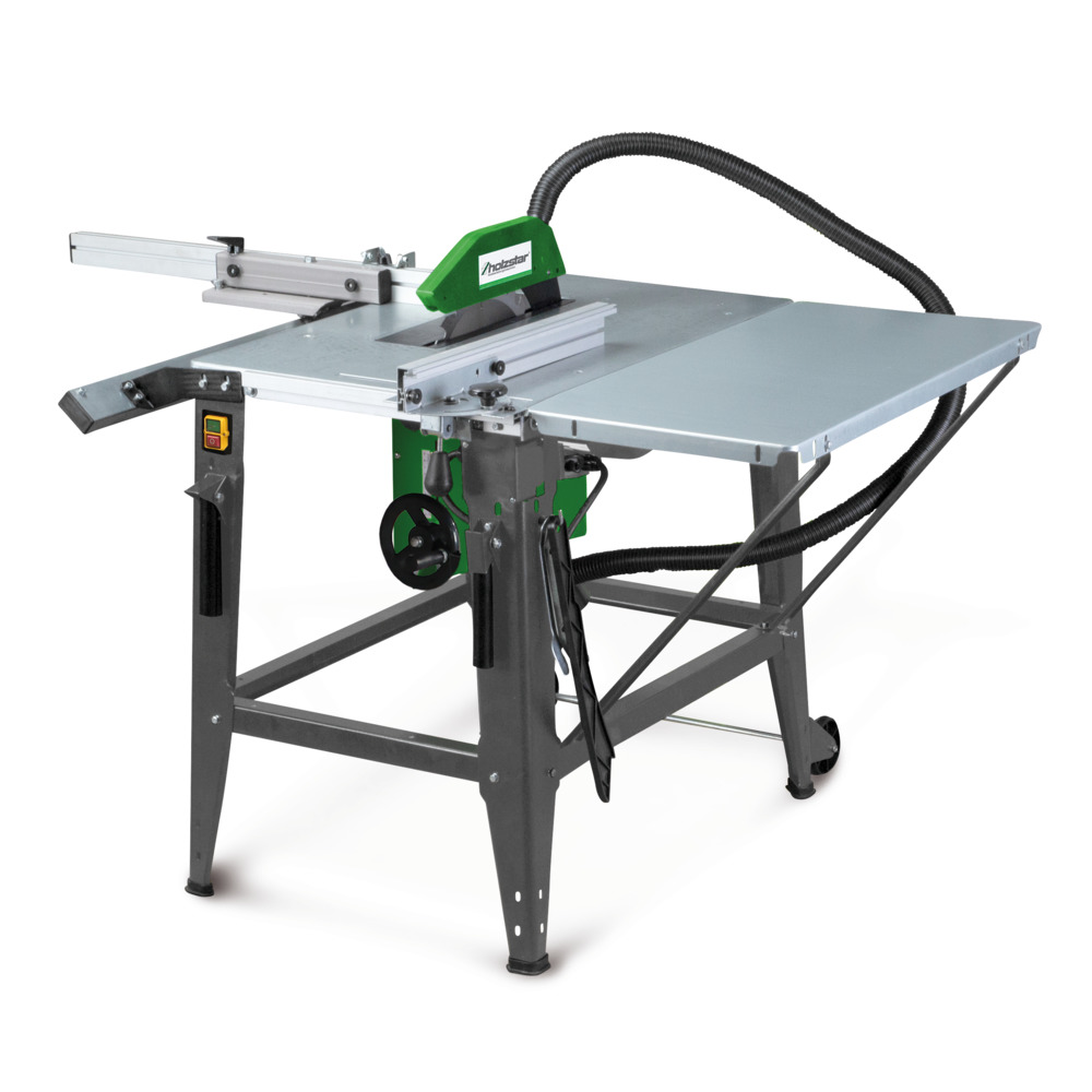 Robuste, verzinkte Baukreissäge für alle Arbeiten rund um Hof und Garten und Tischkreissäge für den Innenausbau, Komplettset mit Hartmetall-Kreissägeblatt, Tischverlängerung, Schiebeschlitten mit Gehrungsanschlag, kombinierter Parallel-/Gehrungsanschlag, Fahrwerk. Mit 350 mm Hartmetall Sägeblatt mit max. 83 mm Schnitttiefe (bei 45° noch 60 mm), 800 x 550 mm Tisch, Absaubanschlüsse, unmontiert, 53 kg.